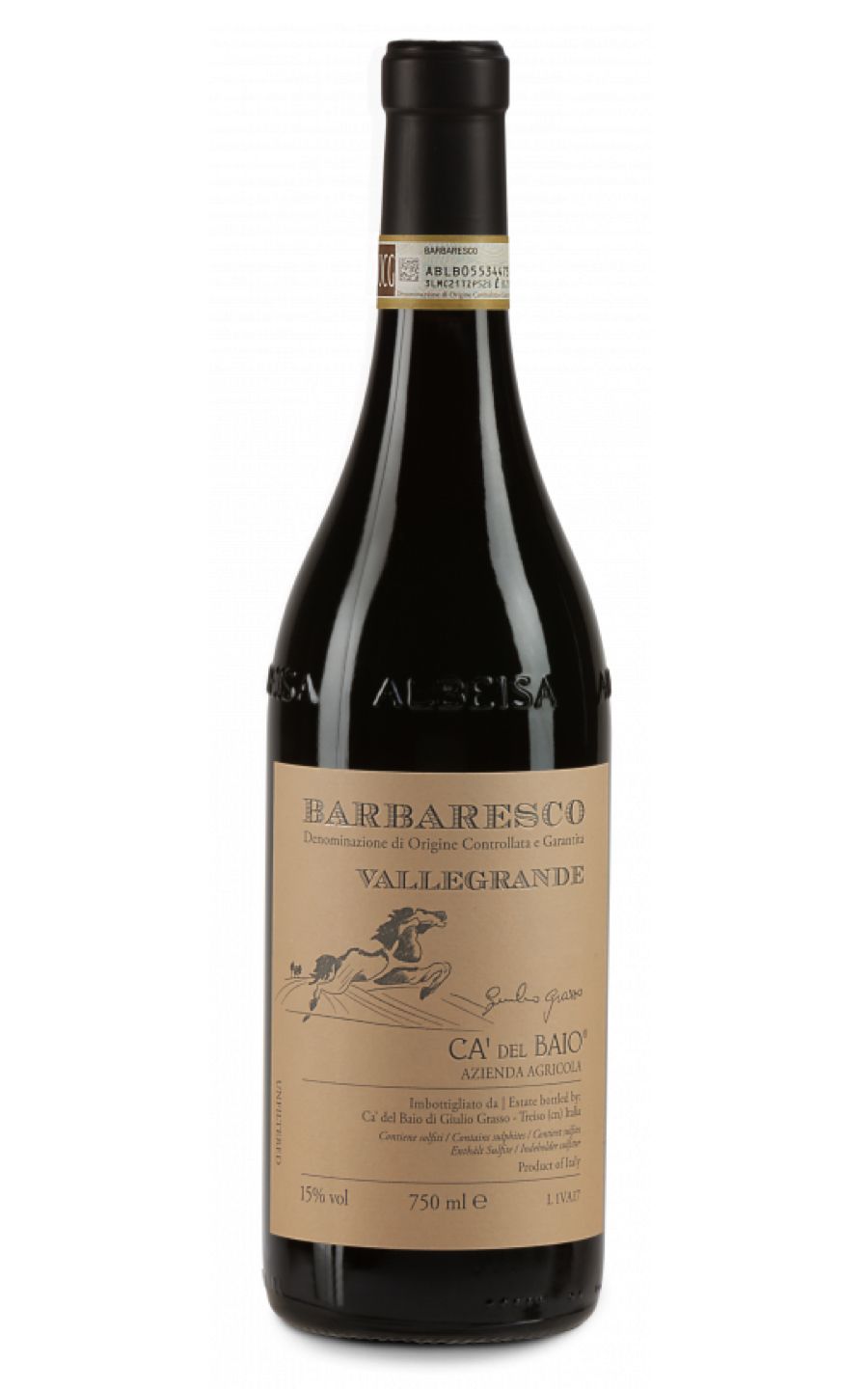Ca' del Baio Barbaresco DOCG Vallegrande is a resplendent Italian wine from the renowned Piedmont region. Luminous in its ruby red colour, it offers an enticing bouquet of ripe plum, berry fruit, and subtly spiced undertones. With its full-bodied elegance, this wine has a well-structured and harmonious taste, while still displaying a concentrated fruitiness. The finish lingers long with a delightful hint of nutmeg and vanilla. Matured in oak barrels, its stellar complexity lends itself brilliantly to a variety of foods, yet it's elegant enough to be savoured on its own.
